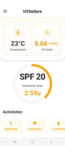 Based on your location, the UVSeQure app informs you about weather conditions and the UV index. In addition the app advises you on using sunscreen with a SPF factor based on the UV radiation. A timer reminds you of reapplying sunscreen, to stay protected from UV radiation during the day. App settings include skin type and activity (e.g. swimming, cycling, sports), that influence the timeframe to reapply sunscreen.
